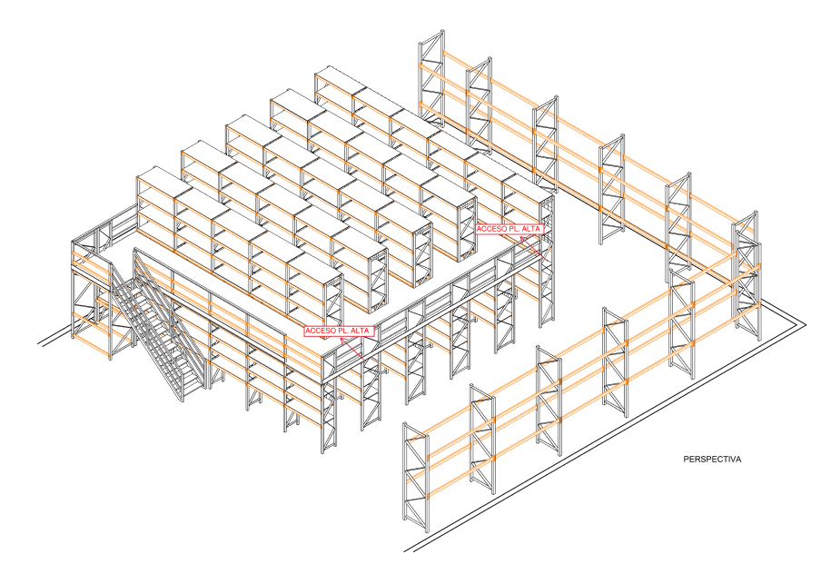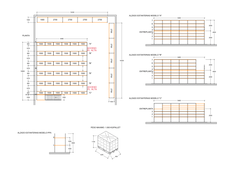 - 1 rack simple de 7 niveles, con una longitud total 9.480 mm, 600 mm de fondo y una altura total de 4.500 mm.
