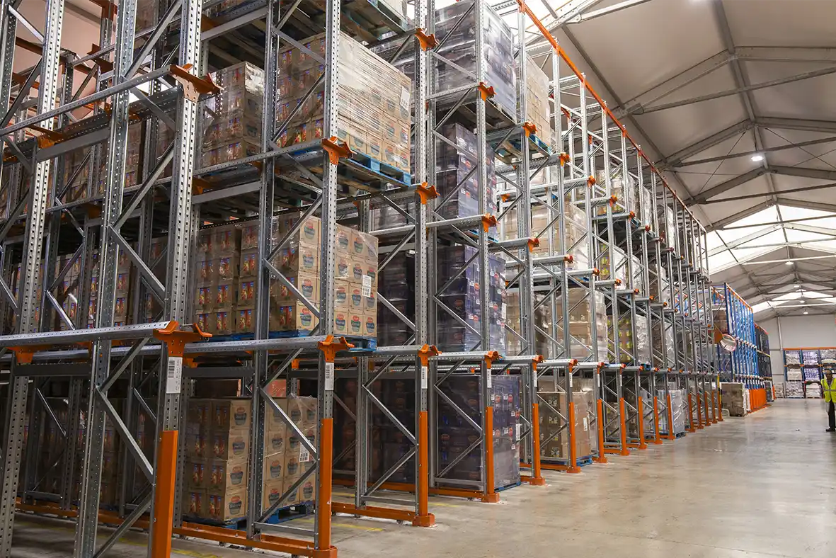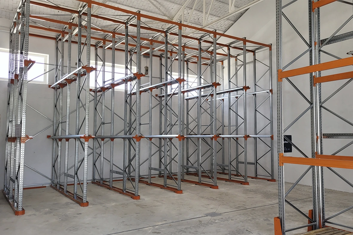 Los racks Drive-In se forman por calles de carga con carriles de apoyo sobre los que se deposita uniformemente la carga dispuesta en paletas.