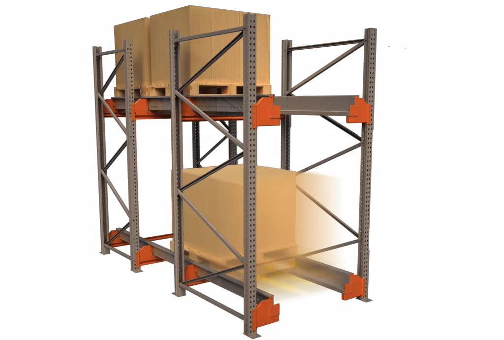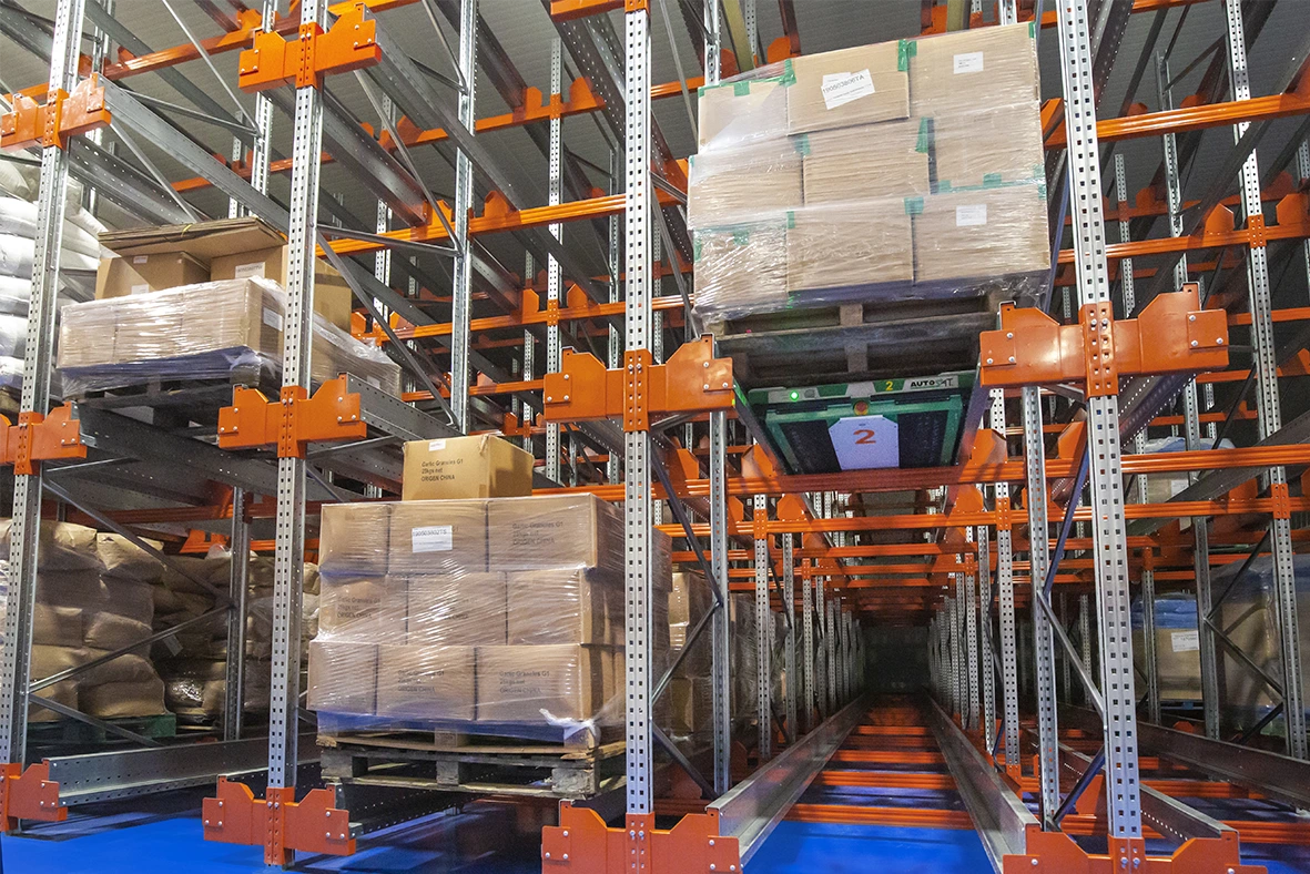 - La plataforma radio shuttle detecta la mercancía, la eleva y mueve por el interior de la estantería hasta la posición de la última paleta almacenada, compactando la mercancía y maximizando el espacio de almacenaje.